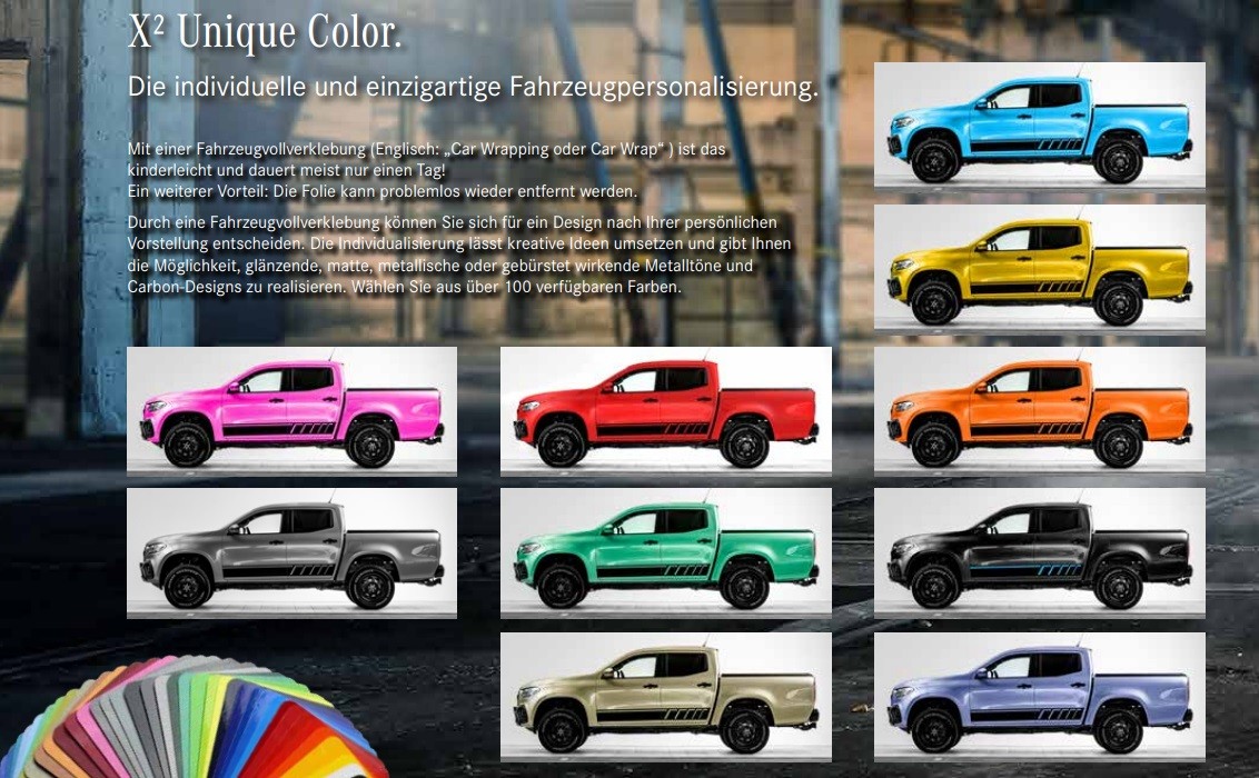 В дополнение к оффроудному пакету X² предлагаются цветовой пакет X² (порядка 100 уникальных цветов, включая фиолетовый и розовый) за 4165 евро, дизайн-пакет X² (тонировка, наклейки, отделка элементов экстерьера чёрным глянцем) за 2368 евро, подогрев-пакет X² (автономный подогреватель с дистанционным управлением) за 2499 евро и защитный пакет X² (крышка кузова рулонного типа и отделка внутренностей кузова пластиком) за 4606 евро. Итого полный комплект доработок X² обойдётся владельцам пикапов аж в 18 694 евро! Ну а что вы хотели – это же Mercedes-Benz… Не исключено, что вскоре пакеты X² будут предложены и в других городах и странах, в том числе в России.